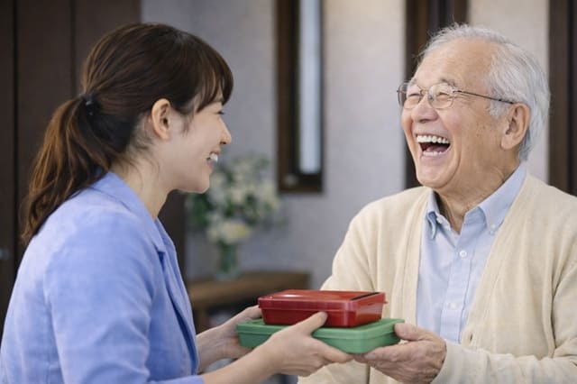 高齢者の嗜好や栄養バランスを考えた食事をお届けします。お弁当のお届け時にスタッフが直接お声がけを行い、体調や様子を確認し、異変があった場合はご家族へご連絡します。
